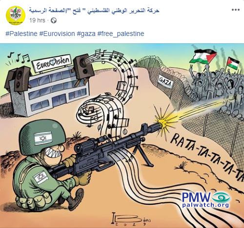 Fatah posted the cartoon above on Facebook, showing an Israeli soldier shooting at Palestinians in Gaza. Musical notes are flowing from the "Eurovision" but turn into an ammunition belt for the soldier's machine gun.