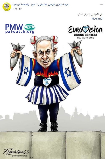 Last night The Netherlands won the Eurovision Song Contest 2019 in Tel Aviv. During the week leading up to the final, Fatah campaigned for the boycott of the Eurovision as documented by Palestinian Media Watch, but to no avail. Today, both Fatah and the Palestinian Authority daily published cartoons linking Israeli music to violence, including the visual depiction of the common PA libel that Israel intentionally kills civilians.