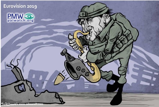 The official PA daily reacted to the Eurovision being held in Israel with this cartoon, showing an Israeli soldier playing a saxophone with a bullet being fired from it at the ruins of a building. Text on cartoon in English: "Eurovision 2019":