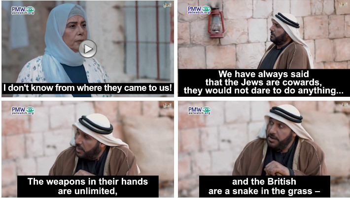 In a different episode, a woman wonders how it happened that the Arab forces were defeated by the Jews since "the Jews are cowards." The man replies that "the British are a snake in the grass... they gave [the Jews] everything." Note: This is not historically correct; Britain did not arm the Jewish forces: