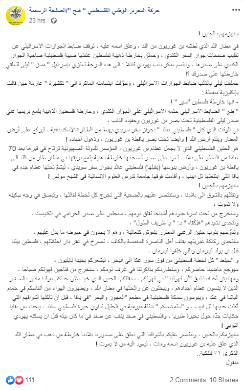 Fatah Facebook on Palestinian connection to “Palestine”: “We will kill them with love for our land… Our past will pain your present”