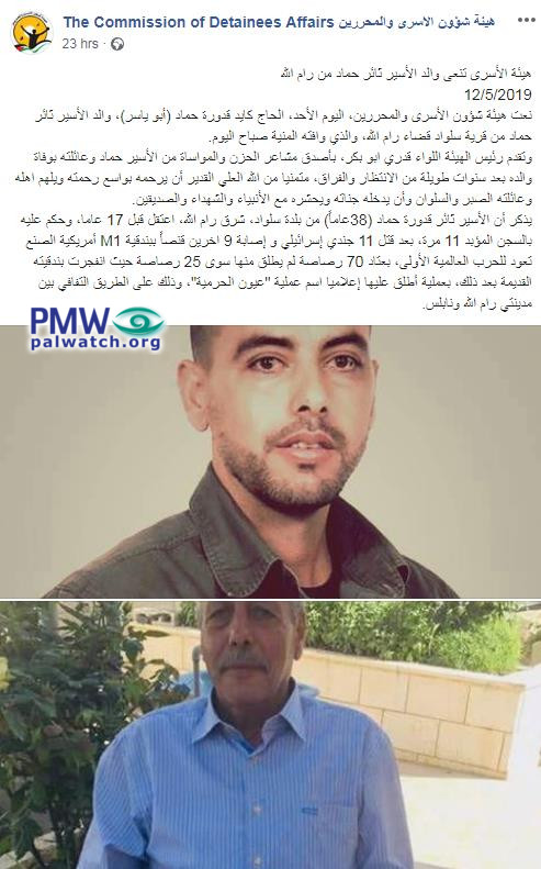 Posted text: “The [PLO] Commission of Prisoners’ Affairs today, Sunday [May 12, 2019], announced the death of Kayed Qadura Hammad ‘Abu Yasser,’ the father of prisoner Thaer Hammad (i.e., terrorist, murdered 10)…