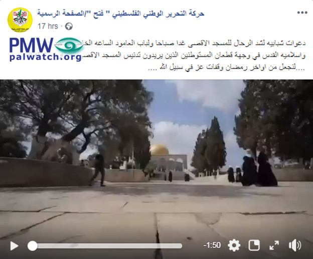 Posted text: "Calls from the [Al-Harak] Al-Shababi [Movement] (an umbrella group of Palestinian youth movements that has been declared a terrorist organization by Israel –Ed.) to come to the Al-Aqsa Mosque tomorrow morning [June 2, 2019] and to the Damascus Gate at 5:00 p.m. in order to emphasize the Arabness and Islamicness of Jerusalem to the herds of settlers who want to desecrate the Al-Aqsa Mosque and the streets and alleys of Jerusalem in order to turn the last days of the Ramadan into resolve for Allah."