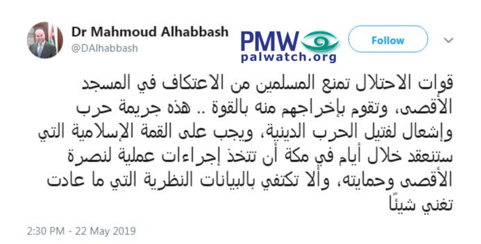 PA Supreme Shari’ah Judge Mahmoud Al-Habbash: “The occupation forces are preventing Muslims from secluding themselves in the Al-Aqsa Mosque [according to the Ramadan custom], and are removing them from it by force. This is a war crime and igniting the fuse of religious war. The Islamic Summit that will convene in a number of days in Mecca must take practical steps in order to help the Al-Aqsa Mosque and defend it, and not make do with announcing theories that are no longer beneficial in any way.”