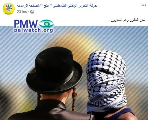 Image of religious Jew and Arab masked rioter facing each other with Dome of the Rock in background, with text: “We remain and they are temporary”