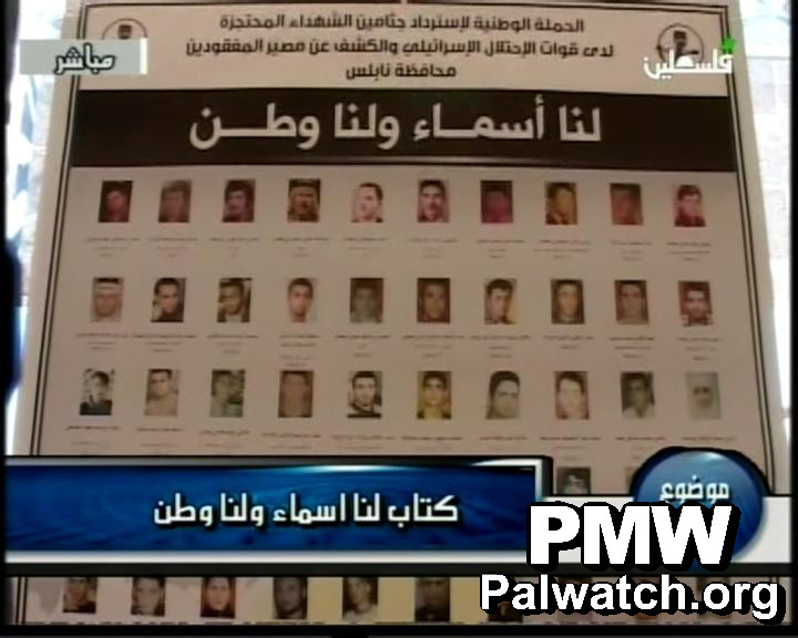 The program Palestine This Morning interviewed Dr. Assam Al-Aruri, director of the Al-Quds Center for Legal Assistance and Human Rights, concerning a new book, We Have Names, We Have a Homeland, documenting the names of Palestinian Martyrs (Shahids) whose bodies are being held by Israel. The program broadcast a display of photographs of “Martyrs” whose bodies are being held by Israel, including suicide bomber Wafa Idris. Al-Aruri says that the Palestinian government has decided to declare Aug. 27th a national day of remembrance for Palestinian MIA's, since that was the date when the campaign was launched in 2008. Al-Aruri describes the book as including a photograph of each “Martyr” with his/her name, and the date and circumstances of his/her Martyrdom-death, with a view to liberating the “Martyr” from numerical confinement and transforming him into a face with a name.