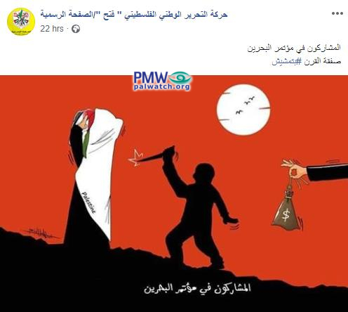 Fatah cartoon against Bahrain economic conference depicts participants stabbing “Palestine” in the back for dollars