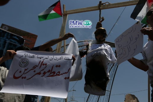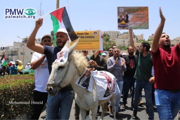 The image shows a donkey with pictures of Trump and King of Bahrain Hamad bin Isa Al Khalifa on it. The demonstrators are waving Palestinian flags and carrying signs, and one demonstrator is wearing a black shirt with the PA map of “Palestine” that presents all of Israel as “Palestine” together with the PA areas; the map is colored red.