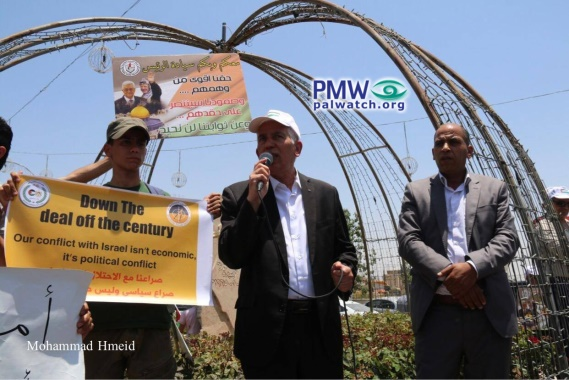 The image shows Bethlehem District Governor Kamel Hamid giving a speech at the event. To the left a young Palestinian is holding a sign.