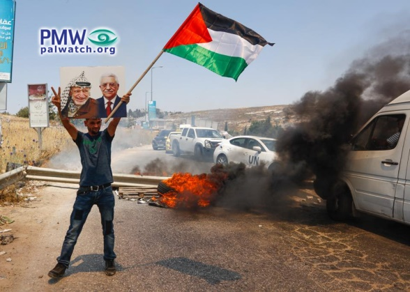 The image shows a Palestinian protester waving a Palestinian flag and a picture of Arafat and Abbas, while a tire burns behind him. A UN car is on the road behind him.