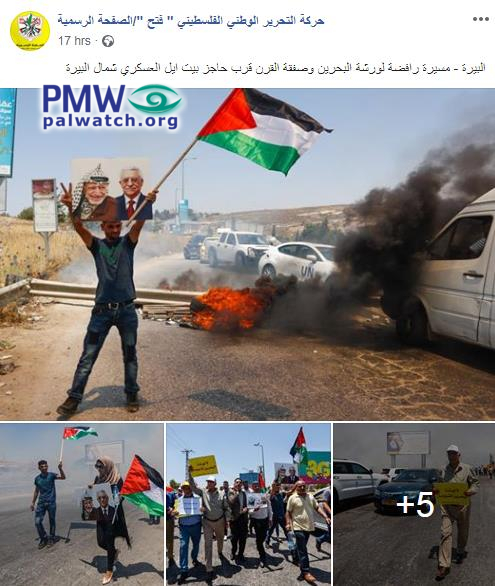 Posted text: “El-Bireh – a procession against the Bahrain conference (refers to a US-led conference in June 2019 focusing on economic aspects of US President Donald Trump’s Middle East peace plan –Ed.) and the deal of the century (i.e., Trump’s Middle East peace plan), next to the military checkpoint at Beit El, north of El-Bireh”