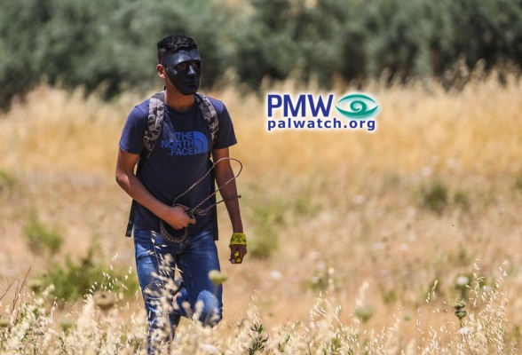 The image shows a young Palestinian masked in black is holding a sling shot.