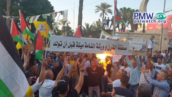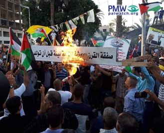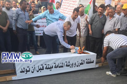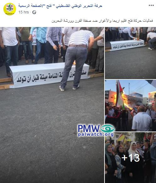 Coffin burnt at Fatah protest against Bahrain Conference and US peace plan: "The deal of the century and the workshop in Manama [Bahrain] died even before they were born"