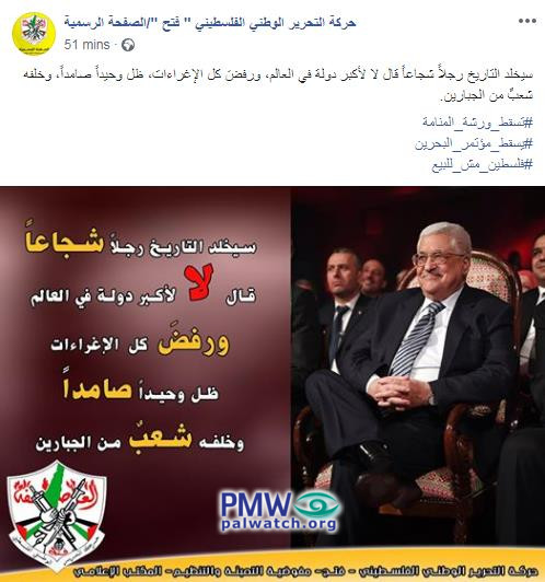 Fatah praises Abbas for rejecting Bahrain Conference and unpublished US peace deal: “History will commemorate a brave man who said 'No' to the greatest state in the world”