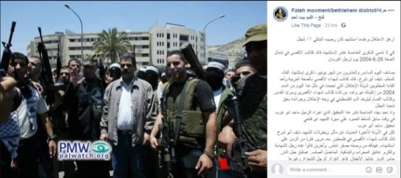 Let us not forget the 15th anniversary of the death as a Martyr of the commander of the Al-Aqsa [Martyrs’] Brigades (i.e., Fatah’s military wing) in the northern West Bank, June 26 [2004], the day of the knight’s death.