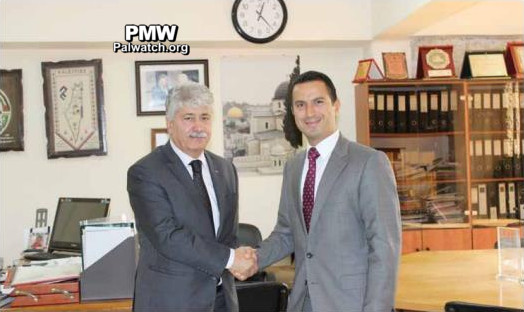The article includes a picture of PLO Executive Committee member, head of the PLO Department of Labor and Planning, and Secretary-General of the Palestinian Popular Struggle Front (PPSF) Ahmed Majdalani hosting a foreign representative at his office. Hanging on the wall of the office in the background on the left side of the picture is the PA map of “Palestine” that presents all of Israel as “Palestine” together with the PA areas, with the word “Palestine” written on it in English and a Palestinian flag on it.