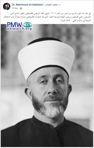 Posted text: “On this day, on July 4, 1974, the great Palestinian national leader, [former] Mufti of Palestine and Head of the Arab Higher Committee Haj Amin Al-Husseini (see note below –Ed.) – who for many years led the Palestinian struggle against the British and Israeli occupation – passed away; our leaders are our role models.”