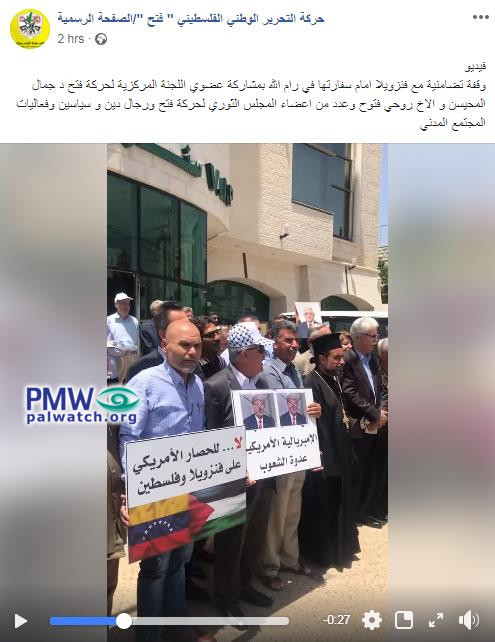 The video shows the rally in front of the Venezuelan embassy in which participants are holding pictures of PA Chairman Mahmoud Abbas and Venezuelan President Nicolás Maduro, posters with Venezuelan and Palestinian flags, and a poster showing pictures of US President Donald Trump with an “X” across his face.