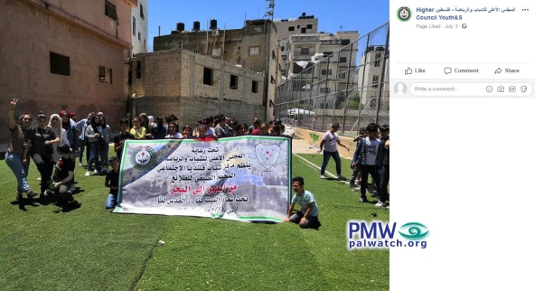 Text on sign: “Under the auspices of the [PLO] Supreme Council for Sport and Youth Affairs