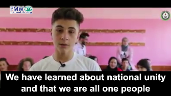Young girls and boys describe that they have learned about recycling, first aid, and that sports help to keep a healthy lifestyle. But in between these positive educational messages, the kids were also taught that the Palestinians are “one hand against the enemies,” and that two terrorist murderers - Abu Jihad and Dalal Mughrabi - are among their leaders.