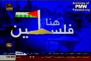 The central element in the intro to the weekly PA TV show "Here is Palestine" is the map of "Palestine" replacing all of Israel with the Palestinian flag flying above it.