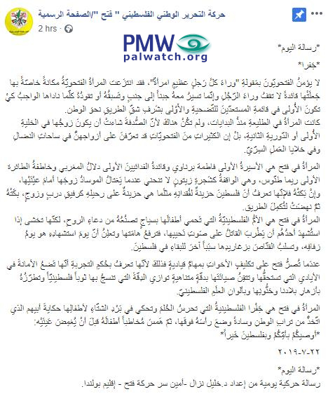 The women of Fatah are the first female prisoner Fatima Barnawi (i.e., terrorist, placed a bomb in a movie theater), the first female commander of the self-sacrificing fighters (Fedayeen) Dalal Mughrabi (i.e., terrorist who led murder of 37, 12 of them children), and the first female airplane hijacker Rima Tannous (i.e., terrorist, participated in murder of 1). They are the ones who stand like unbending olive trees when the Mossad (Israeli Secret Intelligence Service) assassinates their husbands before their eyes. If they cry for them, it is because they know that Palestine is sad for the loss [of their husbands], as they are sad for their deaths as companions and as husbands. They cry for them, and then get up and continue on the path.