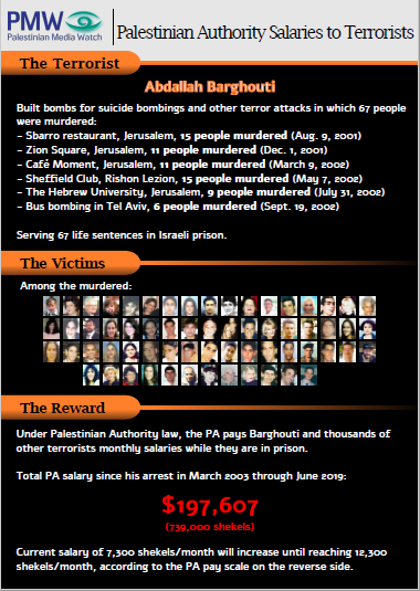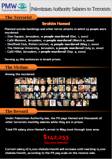 Among the convicted terrorists for this and other attacks were Adballah Barghouti - serving 67 life sentences, one for each of the victims he murdered - and Ibrahim Hamed - serving 54 life sentences, one for each of the victims he murdered. Through June 2019, the PA cumulatively paid them 1,271,000 shekels ($339,862) and continues to pay them thousands of shekels per month.