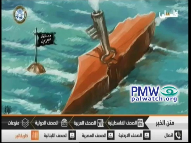 A cartoon is shown of the PA map of “Palestine” that presents all of Israel as “Palestine” together with the PA areas. The PA map is depicted as a steamboat navigating stormy waters, with a key symbolizing the Palestinian refugees' “right of return” serving as its smokestack. To the left of the PA map is a buoy with a black warning flag, on which is written: “Bahrain Conference,” referring to US-led conference in Bahrain in June 2019 focusing on economic aspects of US President Donald Trump's Middle East peace plan.