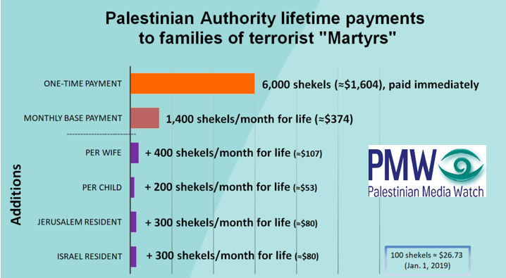 In addition to the salaries the PA pays the imprisoned terrorists, the PA also pays a monthly allowance to the families of dead terrorists (so-called "Martyrs"). Since 2013, the monthly allowance stands at 1,400 shekels per month. Accordingly, the PA had paid, through August 2019, no less than 183,400 shekels ($52,073) to the family of the suicide bomber. It had also paid a similar amount to the families of the two dead terrorists who recruited the members of the cell and created and armed the suicide vest that was used in the attack. It is important to note that the PA also pays a special addition to the families of dead terrorists who were residents of Jerusalem or Israeli citizens.