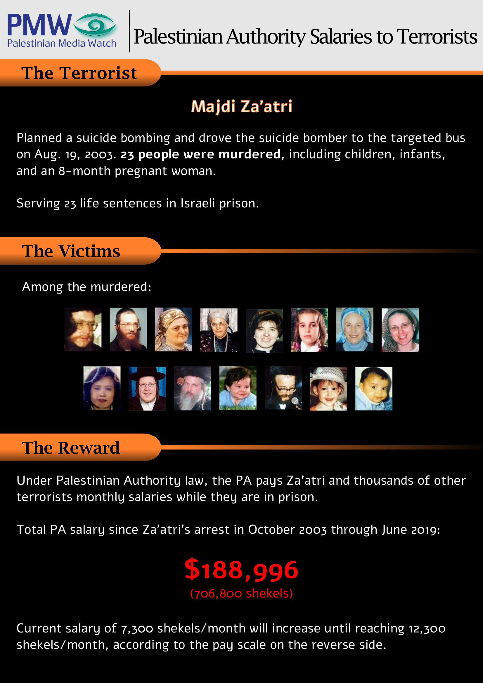 One of the more dominant terrorists who planned the attack was Majdi Za'atri who was sentenced to 23 consecutive life sentences and an additional 50 years. He alone, through June 2019, has been paid by the PA 706,800 shekels ($188,996).