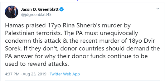 Hours after a bomb exploded at the "Danny Spring" on Friday Aug. 23, murdering 17-year-old Rina Shnerb and injuring her father and brother, US President Donald Trump's Special Representative for International Negotiations Jason Greenblatt took to Twitter to demand that the Palestinian Authority condemn the attack. He added: "If they don't, donor countries should demand the PA answer for why their donor funds continue to be used to reward attacks."