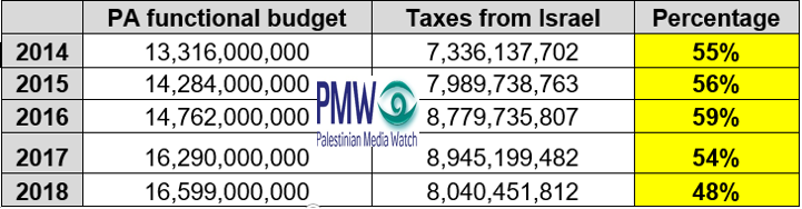 Every month Israel collects hundreds of millions of shekels and transfers them to the PA. These funds constitute 50% of the entire PA budget: