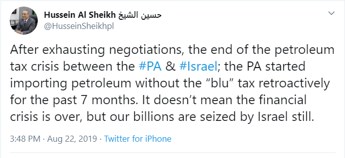 Thirdly, statistics published by the PA Ministry of Finance (and independently verified by Palestinian Media Watch) show that in the first half of 2019, the income from “Blu” taxes was 1.27 billion shekels - reflecting a monthly average of approximately 211 million shekels. Which means, that by accepting 2 billion shekels (which is hundreds of millions more than the “Blu” taxes revenue), the PA has de facto given in to Israel's demand to accept the tax money minus the terror money deduction. To save face, the PA is lying to its own people and to the international community claiming it is only agreeing to receive the "Blu" tax money.