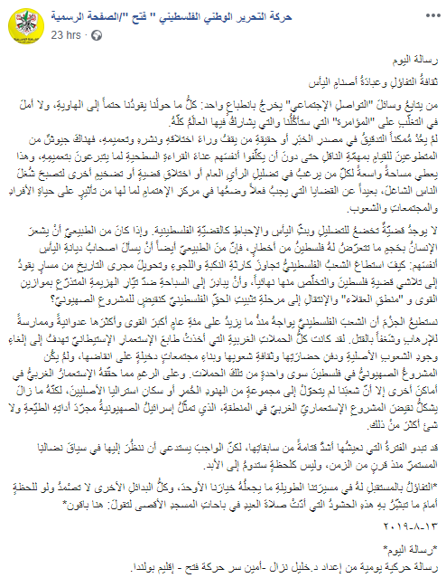 Text posted on the official Fatah Facebook page, the “daily message” by Secretary of Fatah’s Poland Branch Dr. Khalil Nazzal