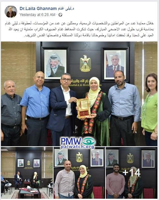 Posted text: "A number of citizens, official figures, and representatives of institutions blessed [District Governor of Ramallah and El-Bireh] Dr. Laila Ghannam for the approaching Eid Al-Adha(i.e., the Sacrifice Feast). District Governor Ghannam blessed the dear guests and wished them that at the next holiday our people will have already realized its wishes and aspirations to establish its independent state whose capital is Jerusalem."