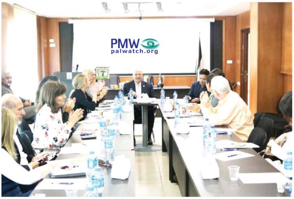 PLO official receives delegation of academics next to PLO logo featuring map of “Palestine” that erases Israel