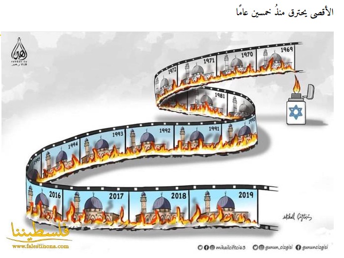The cartoon shows a filmstrip with shots of the Al-Aqsa Mosque and years noted progressively in the frames from 1969 to 2019. The filmstrip is being lit at its beginning in 1969 by a cigarette lighter with a Star of David on it, and the flames are seen continuing in the foreground of every shot. This refers to the 50th anniversary of the date when a mentally ill Australian Christian, Michael Rohan, set the Al-Aqsa Mosque on fire.