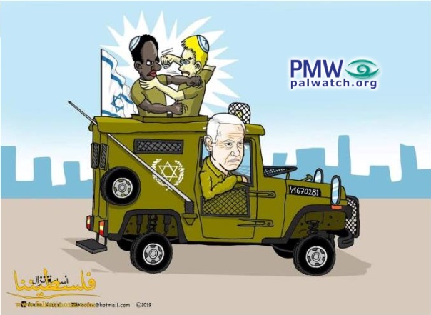 The cartoon shows Israeli Prime Minister Benjamin Netanyahu driving an Israeli military vehicle with a troubled expression on his face and sweat dripping down his forehead. Two Israeli soldiers with kippahs (Jewish skullcaps) on their heads – one Ethiopian and one blond – are standing in the vehicle and fighting each other. There is a Star of David on the side of the vehicle and an Israeli flag flying from it.