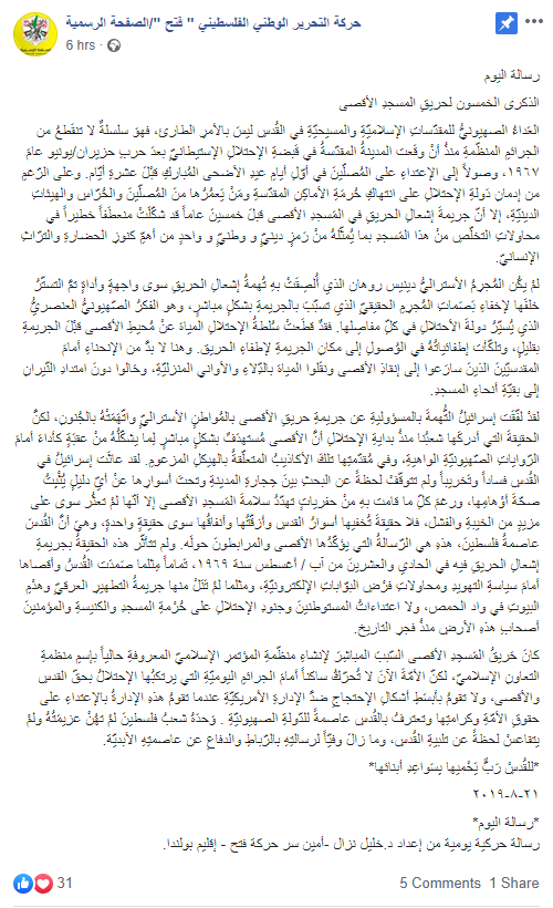 Posted text: “The 50th anniversary of the Al-Aqsa Mosque arson