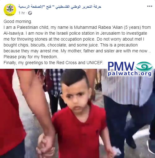 I am a Palestinian child, my name is Muhammad Rabea 'Alian (5 years) [parentheses in source] from Al-Isawiya (i.e., predominantly Arab neighborhood of Jerusalem). I am now in the Israeli police station in Jerusalem to investigate me for throwing stones at the occupation police (sic.). Do not worry about me! I bought chips, biscuits, chocolate, and some juice. This is a precaution because they may arrest me. My mother, father and sister are with me now .. Please pray for my freedom.