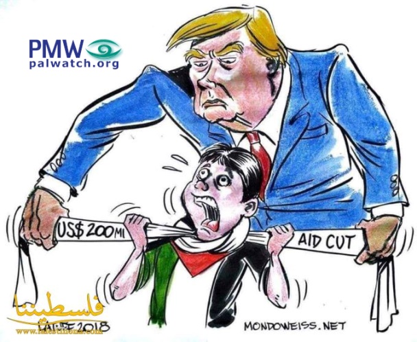 The cartoon shows US President Donald Trump strangling a Palestinian boy, who is wearing a Palestinian flag shirt, with a white strip of cloth. On the cloth is written in English: “US $200 mi aid cut,” in reference to the US announcement on Aug. 24, 2018, that it was cutting $200 million in economic support funds for Palestinian programs in the West Bank and Gaza.