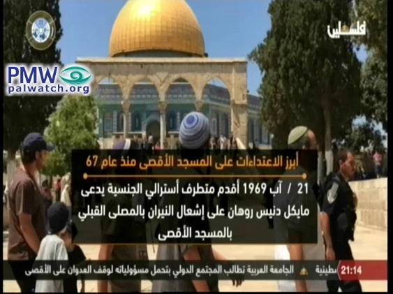 Official PA TV newsreader: "Today is the 50th anniversary of the Al-Aqsa Mosque arson by the terrorist settler Michael Denis [Rohan] (sic., a mentally ill Australian Christian tourist), which led to the burning of more than two thirds of the total area of the mosque, including the Nour Al-Din Mahmoud pulpit which Saladin Al-Ayyubi (i.e., founder of the 12th-13th century Ayyubid dynasty) placed [there]."