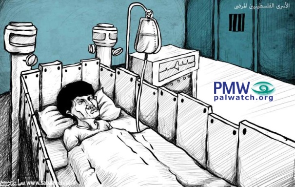 The cartoon shows a sick prisoner lying on a bed that is surrounded by a security wall with two guard towers at either corner of the head of the bed. On the monitor next to the bed showing the prisoner’s pulse is the PA map of “Palestine” that presents all of Israel as “Palestine” together with the PA areas. A prison door and walls are seen in the background.