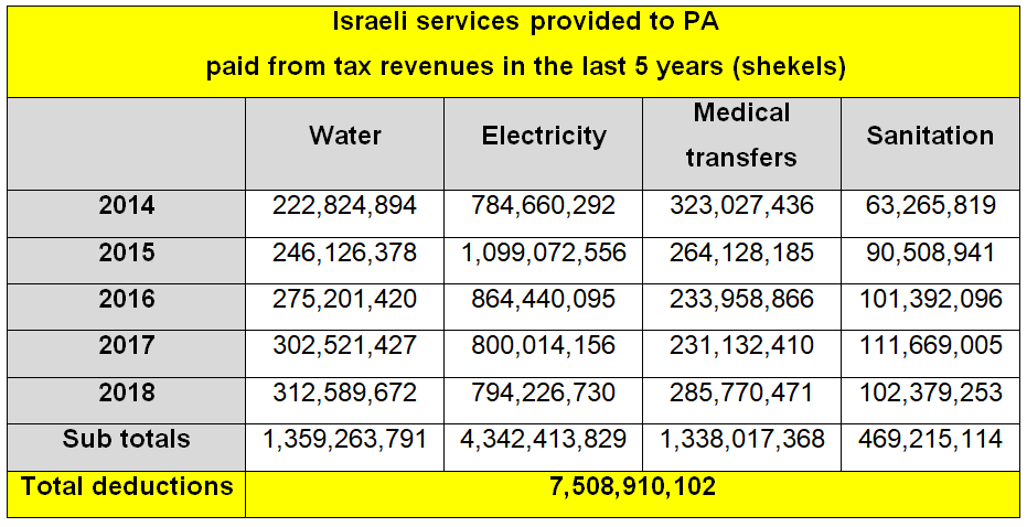Based on the report submitted, the Security Cabinet decided to deduct 502 million shekels from the 2019 PA tax revenues, as prescribed by the law, in 12 equal parts, totaling almost 42 million shekels/month. This sum was deducted from the tax income which, on average in 2018, was 670 million shekels.