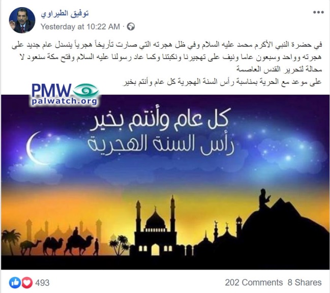 Posted text: “In the presence of noble Prophet Muhammad, peace be upon him, and in light of his Hijra (i.e., “journey/migration,” refers to the journey of Muhammad and his followers from Mecca to Medina in 622 C.E.) that became the Hijri calendar, a new year begins from [the date of] his Hijra, and 71 years and then some since our Hijra and Nakba (i.e., “the catastrophe,” the Palestinian term for the establishment of the State of Israel). And just as our Messenger, peace be upon him, returned and conquered Mecca, so too we will undoubtedly return to liberate Jerusalem the capital.”
