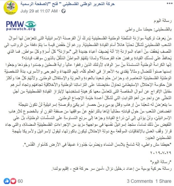 Fatah official: Martyrs and prisoners are “the builders of the contemporary Palestinian national character,” therefore we must suffer budget cuts