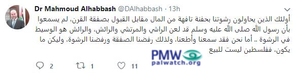 Posted text: “Those who are attempting to bribe us with a handful of money in exchange for agreeing to the deal of the century (refers to US President Donald Trump’s as yet unpublished Middle East peace plan –Ed.) have not heard that Prophet [Muhammad], peace be upon him, cursed those who bribe, those who are bribed, and those who mediate a bribe, while we have heard and obeyed. Therefore we have rejected the deal and rejected the bribe. What will be will be; Palestine is not for sale.”
