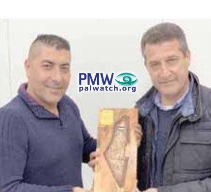 The article includes a picture of the honorary plaque being presented at the event. The plaque features the PA map of “Palestine” that presents all of Israel as “Palestine” together with the PA areas, and on it is the Palestinian flag.