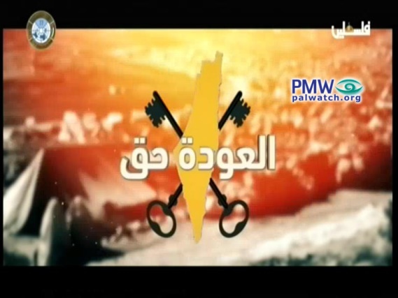 Visual: The PA map of “Palestine” that presents all of Israel as “Palestine” together with the PA areas is shown, and behind it are crossed keys symbolizing “the right of return” of the Palestinian refugees. In the background is a picture of refugee camp tents.