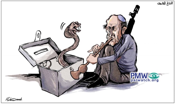 Palestinian Authority daily cartoon on Israeli elections depicts settler as a snake charmer playing a snake out of a ballot box